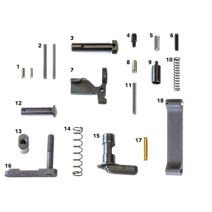 The Lower Parts Kit includes all the internal parts necessary to complete or rebuild your lower receiver and grip. This quality mil-spec kit features an improved safety detent and their specially designed Posi-Lock safety, which provides the end user a satisfying and positive tactile feedback when engaging the safe or fire position.
