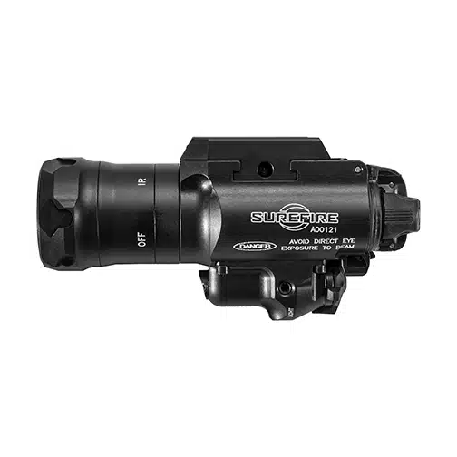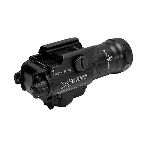 Even better, the X400VH features Surefire’s innovative V-Series head, which provides both white light and infrared illumination, plus an integral Class 1 infrared laser aiming device. Choose between 350 lumens of visible, tactical level light or twist the bezel’s self locking selector to switch to generate 120 mW of IR illumination for use with NVGs. The infrared laser provides a highly visible dot for aiming during stealth operations where focusing on iron sights with NVGs can be challenging.