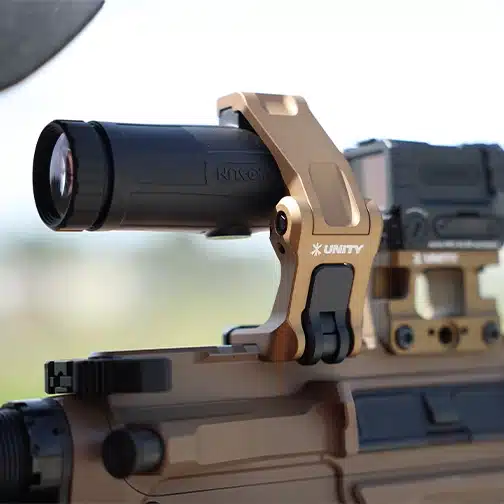 The FAST FTC Holosun mount utilizes a force-to overcome mechanism to stow the magnifier below the sight plane and within the footprint of the weapon’s receiver. Developed specifically for Holosun magnifiers, it provides optimal alignment for a cleaner sight picture when paired with a red dot also mounted at 2.26″. UNITY’s FTC (flip-to-center) technology replaces legacy flip-to side designs, removing snag hazards. It includes a low profile integrated FAST QD Lever. While the FAST FTC OMNI is compatible with Holosun magnifiers, the dedicated FAST FTC Holosun mount is recommended for the best performance and integration.
