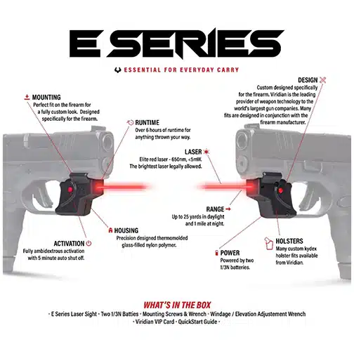 The Viridian E-Series Red Laser sight is specifically designed for the everyday conceal and carry owner. This model specific, trigger guard mounted, laser sight offers the most powerful red laser legally available, delivering rapid target acquisition when you need it most.